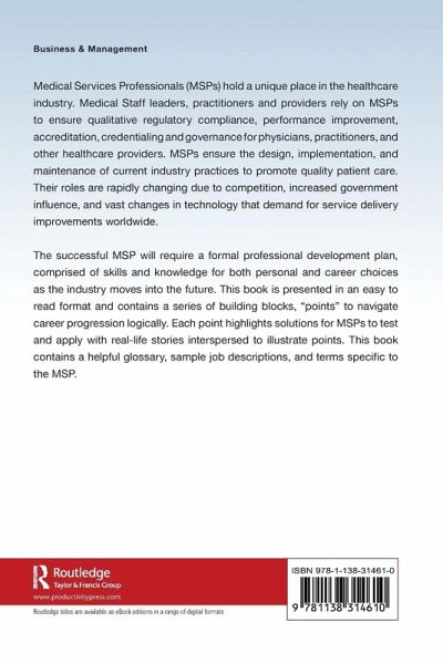 Medical Services Professionals (MSPs) hold a unique place in the healthcare industry. Medical Staff leaders, practitioners and providers rely on MSPs to ensure qualitative regulatory compliance, performance improvement, accreditation, credentialing and governance for physicians, practitioners, and other healthcare providers. MSPs ensure the design, implementation, and maintenance of current industry practices to promote quality patient care. Their roles are rapidly changing due to competition, increased government influence, and vast changes in technology that demand for service delivery improvements worldwide. The successful MSP will require a formal professional development plan, comprised of skills and knowledge for both personal and career choices as the industry moves into the future. This book is presented in an easy to read format and contains a series of building blocks, "points" to navigate career progression logically. Each point highlights solutions for MSPs to test and apply with real-life stories interspersed to illustrate points. This book contains a helpful glossary, sample job descriptions, and terms specific to the MSP.