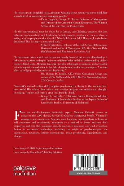 "In the current crisis, which is at its core not merely financial but a crisis of leadership, it behooves executives to deepen their own self-knowledge and their understanding of their people's blind-spots. Abraham Zaleznik provides a thorough, systematic, and accessible yet not simplistic introduction to the field of psychoanalysis for busy managers. A valiant effort to bridge psychodynamics and leadership." - Dr. Thomas D. Zweifel, CEO, Swiss Consulting Group, and author of The Rabbi and the CEO: The Ten Commandments for 21st-Century Leaders