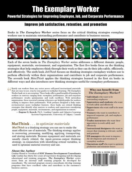 MatThink describes expanded input-process-output thinking strategies for using materials efficiently and effectively. Variables such as composition, shape, size, and finish that define the quality of the results are addressed. Variables affecting the quality of the results are also described. This book focuses on asking the right questions and thinking strategies to improve performance (employee, job, and business performance). The power of asking questions is that questions can apply to many different tasks and work environments. The types of question don't change but the answers may vary depending on the circumstances. The thinking strategies are applied to refining, manufacturing, modifying, and applying materials. Issues affecting the packaging, storing, and transporting of materials are also described. A Job Aid lists the thinking questions you can use to optimize material recovery and use. Learning activities help you apply the strategies to your work and home environment.