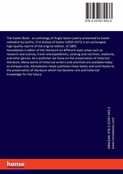 The Exeter Book - an anthology of Anglo-Saxon poetry presented to Exeter cathedral by Leofric, first bishop of Exeter (1050-1071) is an unchanged, high-quality reprint of the original edition of 1895.