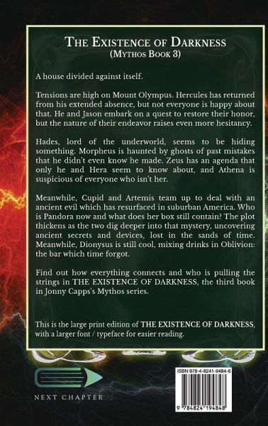 A house divided against itself. Tensions are high on Mount Olympus. Hercules has returned from his extended absence, but not everyone is happy about that. He and Jason embark on a quest to restore their honor, but the nature of their endeavor raises even more hesitancy. Hades, lord of the underworld, seems to be hiding something. Morpheus is haunted by ghosts of past mistakes that he didn't even know he made. Zeus has an agenda that only he and Hera seem to know about, and Athena is suspicious of everyone who isn't her. Meanwhile, Cupid and Artemis team up to deal with an ancient evil which has resurfaced in suburban America. Who is Pandora now and what does her box still contain? The plot thickens as the two dig deeper into that mystery, uncovering ancient secrets and devices, lost in the sands of time. Meanwhile, Dionysus is still cool, mixing drinks in Oblivion: the bar which time forgot. Find out how everything connects and who is pulling the strings in THE EXISTENCE OF DARKNESS, the third book in Jonny Capps's Mythos series. This is the large print edition of The Existence of Darkness, with a larger font / typeface for easier reading.