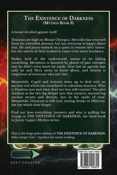 A house divided against itself. Tensions are high on Mount Olympus. Hercules has returned from his extended absence, but not everyone is happy about that. He and Jason embark on a quest to restore their honor, but the nature of their endeavor raises even more hesitancy. Hades, lord of the underworld, seems to be hiding something. Morpheus is haunted by ghosts of past mistakes that he didn't even know he made. Zeus has an agenda that only he and Hera seem to know about, and Athena is suspicious of everyone who isn't her. Meanwhile, Cupid and Artemis team up to deal with an ancient evil which has resurfaced in suburban America. Who is Pandora now and what does her box still contain? The plot thickens as the two dig deeper into that mystery, uncovering ancient secrets and devices, lost in the sands of time. Meanwhile, Dionysus is still cool, mixing drinks in Oblivion: the bar which time forgot. Find out how everything connects and who is pulling the strings in THE EXISTENCE OF DARKNESS, the third book in Jonny Capps's Mythos series. This is the large print edition of The Existence of Darkness, with a larger font / typeface for easier reading.