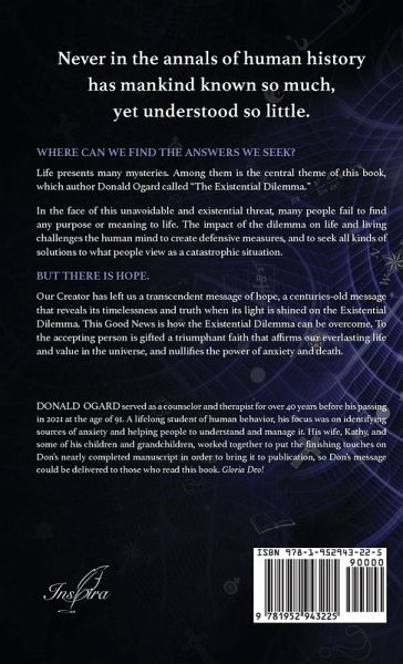 Life presents many mysteries. Among them is the central theme of this book, which author Donald Ogard called "The Existential Dilemma." No one has managed to discover a solution to this dilemma-we all constantly experience the sobering realities of our existence on earth in chronic threats to life and living. The end result is, inevitably, death. In the face of this unavoidable and existential threat, many people fail to find any purpose or meaning to life. The impact of the dilemma on life and living challenges the human mind to create defensive measures, and to seek all kinds of solutions to what people view as a catastrophic situation.This is what we call "intrinsic anxiety." But there is hope. Our Creator has left us a transcendent message of hope, a centuries-old message that reveals its timelessness and truth when its light is shined on the Existential Dilemma. This Good News is how intrinsic anxiety can be overcome ... which is the central theme of this book.