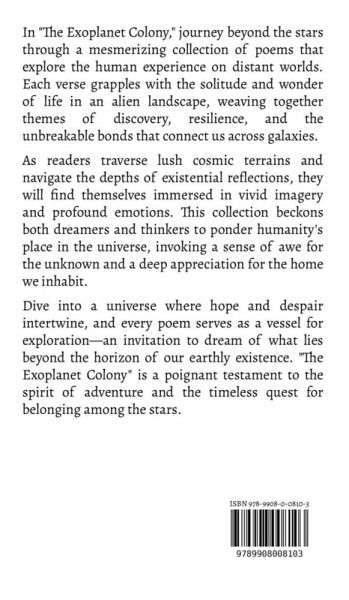 In "The Exoplanet Colony," journey beyond the stars through a mesmerizing collection of poems that explore the human experience on distant worlds. Each verse grapples with the solitude and wonder of life in an alien landscape, weaving together themes of discovery, resilience, and the unbreakable bonds that connect us across galaxies. As readers traverse lush cosmic terrains and navigate the depths of existential reflections, they will find themselves immersed in vivid imagery and profound emotions. This collection beckons both dreamers and thinkers to ponder humanity's place in the universe, invoking a sense of awe for the unknown and a deep appreciation for the home we inhabit. Dive into a universe where hope and despair intertwine, and every poem serves as a vessel for exploration-an invitation to dream of what lies beyond the horizon of our earthly existence. "The Exoplanet Colony" is a poignant testament to the spirit of adventure and the timeless quest for belonging among the stars.