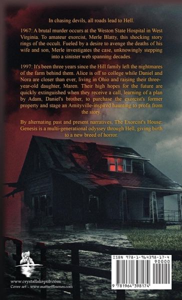 In chasing devils, all roads lead to Hell. 1967: A brutal murder occurs at the Weston State Hospital in West Virginia. To amateur exorcist, Merle Blatty, this shocking story rings of the occult. Fueled by a desire to avenge the deaths of his wife and son, Merle investigates the case, unknowingly stepping into a sinister web spanning decades. 1997: It's been three years since the Hill family left the nightmares of the farm behind them. Alice is off to college while Daniel and Nora are closer than ever, living in Ohio and raising their three-year-old daughter, Maren. Their high hopes for the future are quickly extinguished when they receive a call, learning of a plan by Adam, Daniel's brother, to purchase the exorcist's former property and stage an Amityville-inspired haunting to profit from the story. By alternating past and present narratives, The Exorcist's House: Genesis is a multi-generational odyssey through Hell, giving birth to a new breed of horror. Proudly represented by Crystal Lake Publishing-Tales from the Darkest Depths.