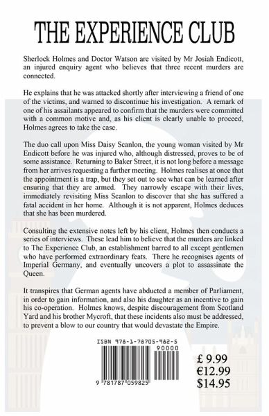 Sherlock Holmes and Doctor Watson are visited by Mr Josiah Endicott, an injured enquiry agent who believes that three recent murders are connected.He explains that he was attacked shortly after interviewing a friend of one of the victims and warned to discontinue his investigation. A remark of one of his assailants appeared to confirm that the murders were committed with a common motive and, as his client is clearly unable to proceed, Holmes agrees to assume the case. The duo call upon Miss Daisy Scanlon, the young woman visited by Mr Endicott before he was injured, who was distressed but of some assistance. Returning to Baker Street, it is not long before a message from her arrives requesting a further meeting. Holmes realises at once that the appointment is a trap, but they set out to see what can be learned after ensuring that they are armed. They narrowly escape with their lives, immediately revisiting Miss Scanlon to discover that she has suffered a fatal accident in her home. Although it is not apparent, Holmes deduces that she has been murdered.Consulting the extensive notes left by his client, Holmes then conducts a series of interviews. These lead him to believe that the murders are linked to The Experience Club, an establishment barred to all except gentlemen who have performed extraordinary feats. There he recognises agents of Imperial Germany, and eventually uncovers a plot to assassinate the Queen. It transpires that German agents have abducted a Member of Parliament, in order to gain information, and also his daughter as an incentive to gain his co-operation. Holmes knows, despite discouragement from Scotland Yard and his brother Mycroft, that these incidents also must be addressed, to prevent a blow to our country that would devastate the Empire.
