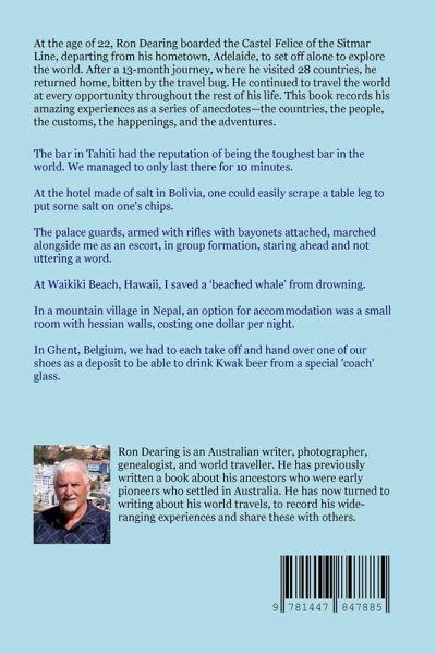 Having set off alone from his hometown Adelaide, Australia, to explore the world at the age of 22, Ron Dearing has a life-changing adventure and returns to Australia bitten by the travel bug. For the rest of his life, he then travels overseas at every opportunity. In The Experiences of a World Traveller, Ron shares a series of anecdotes from the countries he visited, including his first round-the-world trip and many subsequent trips in settings such as the Amazon jungle, the Nepalese Himalayas, Glacier Bay in Alaska, the Greek Islands, the Sahara Desert, and many more places. He writes of the people, the customs, the happenings, and the adventures he experienced. The stories are amusing, light-hearted, dramatic, frightening, of lessons learnt, interesting, bizarre, and, in some cases, amazing.