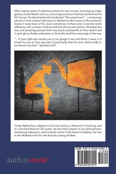After twenty years of watching television and movies and playing video games, Corey Harton came to a stunning conclusion that has transformed his life forever. He developed and conducted "the experiment" - a temporary period of time without television to determine the impact of this powerful media in every facet of life. Upon completion, he has come to see the world differently with a clearer mind-set and lives life as never before. He shares this true and revealing account that may touch and benefit all who read it and to give glory, thanks, and praise to God who lead him every step of the way. "... If your right eye causes you to sin gouge it out and throw it away. It is better for you to lose one part of your body than for your whole body to be thrown into hell." Matthew 5:29