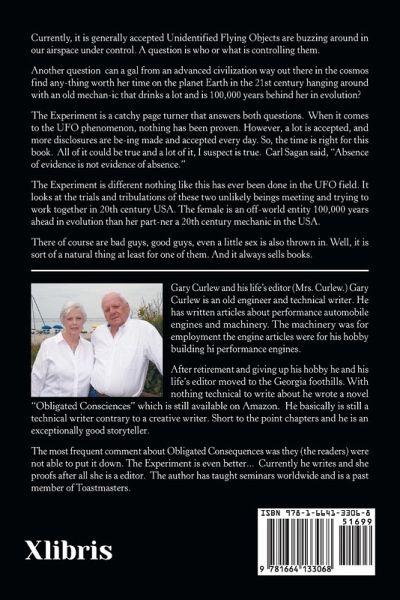 Currently, it is generally accepted Unidentified Flying Objects are buzzing around in our airspace under control. A question is who or what is controlling them. Another question can a gal from an advanced civilization way out there in the cosmos find any-thing worth her time on the planet Earth in the 21st century hanging around with an old mechan-ic that drinks a lot and is 100,000 years behind her in evolution? The Experiment is a catchy page turner that answers both questions. When it comes to the UFO phenomenon, nothing has been proven. However, a lot is accepted, and more disclosures are be-ing made and accepted every day. So, the time is right for this book. All of it could be true and a lot of it, I suspect is true. Carl Sagan said, "Absence of evidence is not evidence of absence." The Experiment is different nothing like this has ever been done in the UFO field. It looks at the trials and tribulations of these two unlikely beings meeting and trying to work together in 20th century USA. The female is an off-world entity 100,000 years ahead in evolution than her part-ner a 20th century mechanic in the USA. There of course are bad guys, good guys, even a little sex is also thrown in. Well, it is sort of a natural thing at least for one of them. And it always sells books.