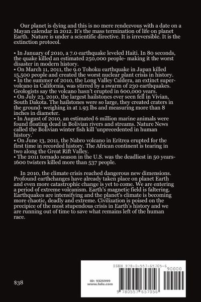 Our planet is dying and this is no mere rendezvous with a date on a Mayan calendar in 2012. It's the mass termination of life on planet Earth. Nature is under a scientific directive. It is irreversible. It is the extinction protocol. In 2010, the planet was ravaged by the worst flooding seen in 1000 years. Profound earth-changes have already devastated the planet and even more catastrophic change is yet to come. We are entering a period of extreme volcanism. Chaitén (Chile) erupted after being dormant for 9500 years, Eyjafjallajökull (Iceland) erupted after 187 years, and Sinabung volcano (Indonesia) erupted after 400 years. Earth's magnetic field is faltering as we approach the solar maximum (2012-2013). Earthquakes are intensifying and the planet's climate is becoming increasingly inhospitable and will be soon pushed to the brink of collapse. Civilization is poised on the precipice of the most stupendous crisis in Earth's history and we are running out of time to save what remains left of the human race.