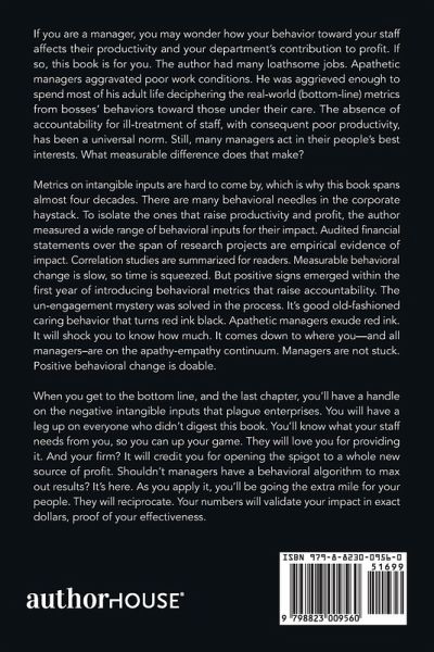 If you are a manager, you may wonder how your behavior toward your staff affects their productivity and your department's contribution to profit. If so, this book is for you. The author had many loathsome jobs. Apathetic managers aggravated poor work conditions. He was aggrieved enough to spend most of his adult life deciphering the real-world (bottom-line) metrics from bosses' behaviors toward those under their care. The absence of accountability for ill-treatment of staff, with consequent poor productivity, has been a universal norm. Still, many managers act in their people's best interests. What measurable difference does that make? Metrics on intangible inputs are hard to come by, which is why this book spans almost four decades. There are many behavioral needles in the corporate haystack. To isolate the ones that raise productivity and profit, the author measured a wide range of behavioral inputs for their impact. Audited financial statements over the span of research projects are empirical evidence of impact. Correlation studies are summarized for readers. Measurable behavioral change is slow, so time is squeezed. But positive signs emerged within the first year of introducing behavioral metrics that raise accountability. The un-engagement mystery was solved in the process. It's good old-fashioned caring behavior that turns red ink black. Apathetic managers exude red ink. It will shock you to know how much. It comes down to where you-and all managers-are on the apathy-empathy continuum. Managers are not stuck. Positive behavioral change is doable. When you get to the bottom line, and the last chapter, you'll have a handle on the negative intangible inputs that plague enterprises. You will have a leg up on everyone who didn't digest this book. You'll know what your staff needs from you, so you can up your game. They will love you for providing it. And your firm? It will credit you for opening the spigot to a whole new source of profit. Shouldn't managers have a behavioral algorithm to max out results? It's here. As you apply it, you'll be going the extra mile for your people. They will reciprocate. Your numbers will validate your impact in exact dollars, proof of your effectiveness.