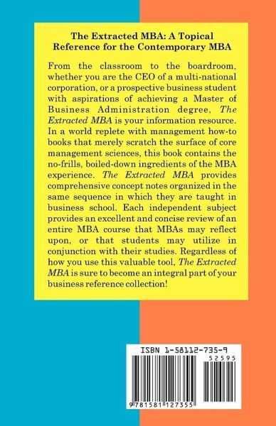 From the classroom to the boardroom, whether you are the CEO of a multi-national corporation, or a prospective business student with aspirations of achieving a Master of Business Administration degree, management sciences, this book contains the no-frills, boiled-down ingredients of the MBA experience. The Extracted MBA provides comprehensive concept notes organized in the same sequence in which they are taught in business school. Each independent subject provides an excellent and concise review of an entire MBA course that MBAs may reflect upon, or that students may utilize in conjunction with their studies. Regardless of how you use this valuable tool, The Extracted MBA is sure to become an integral part of your business reference collection!