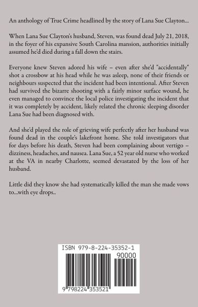 An anthology of True Crime headlined by the story of Lana Sue Clayton... When Lana Sue Clayton's husband, Steven, was found dead July 21, 2018, in the foyer of his expansive South Carolina mansion, authorities initially assumed he'd died during a fall down the stairs. Everyone knew Steven adored his wife - even after she'd "accidentally" shot a crossbow at his head while he was asleep, none of their friends or neighbours suspected that the incident had been intentional. After Steven had survived the bizarre shooting with a fairly minor surface wound, he even managed to convince the local police investigating the incident that it was completely by accident, likely related the chronic sleeping disorder Lana Sue had been diagnosed with. And she'd played the role of grieving wife perfectly after her husband was found dead in the couple's lakefront home. She told investigators that for days before his death, Steven had been complaining about vertigo - dizziness, headaches, and nausea. Lana Sue, a 52 year old nurse who worked at the VA in nearby Charlotte, seemed devastated by the loss of her husband. Little did they know she had systematically killed the man she made vows to...with eye drops..