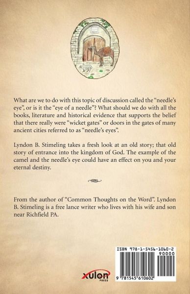 What are we to do with this topic of discussion called the "needle's eye", or is it the "eye of a needle"? What should we do with all the books, literature and historical evidence that supports the belief that there really were "wicket gates" or doors in the gates of many ancient cities referred to as "needle's eyes". Lyndon B. Stimeling takes a fresh look at an old story; that old story of entrance into the kingdom of God. The example of the camel and the needle's eye could have an effect on you and your eternal destiny. From the author of "Common Thoughts on the Word". Lyndon B. Stimeling is a free lance writer who lives with his wife and son near Richfield PA.