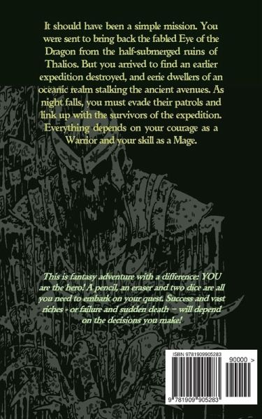 It should have been a simple mission. You were sent to bring back the fabled Eye of the Dragon from the half-submerged ruins of Thalios. But you arrived to find an earlier expedition destroyed, and eerie dwellers of an oceanic realm stalking the ancient avenues. As night falls, you must evade their patrols and link up with the survivors of the expedition. Everything depends on your courage as a Warrior and your skill as a Mage. This is fantasy adventure with a difference: YOU are the hero. A pencil, an eraser and two dice are all you need to embark on your quest. Success and vast riches - or failure and sudden death - will depend on the decisions you make. The Eye of the Dragon is part of the classic Golden Dragon Gamebook series.