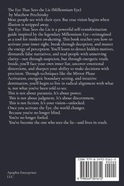 The Eye That Sees the Lie (Millennium Eye) by Matthew Petchinsky Most people see with their eyes. But true vision begins when illusion is stripped away. The Eye That Sees the Lie is a powerful self-transformation guide inspired by the legendary Millennium Eye-reimagined as a tool for modern awakening. This book teaches you how to activate your inner sight, break through deception, and master the energy of perception. You'll learn to detect hidden motives, dismantle false narratives, and read people with unnerving clarity-not through suspicion, but through energetic truth. Inside, you'll face your own inner liar, uncover emotional distortions, and sharpen your ability to make decisions with precision. Through techniques like the Mirror Phase Activation, energetic boundary setting, and intuitive domination, you'll begin to live in radical alignment with what is, not what you've been told to see. This is not about paranoia. It's about power. This is not about judgment. It's about discernment. This is not fiction. It's your vision-unlocked. Once you activate the Eye, the world changes. Because you're no longer blind. You're no longer fooled. You've become the one who sees the lie-and lives in truth.