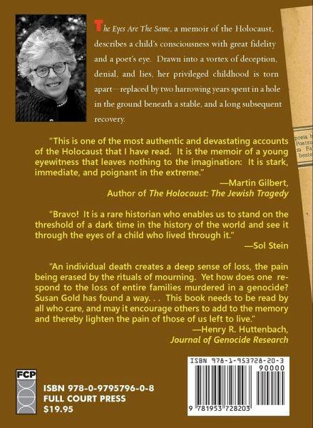 The Eyes Are The Same, a memoir of the Holocaust, describes a child's consciousness with great fidelity and a poet's eye. Drawn into a vortex of deception, denial, and lies, her privileged childhood is torn apart-replaced by two harrowing years spent in a hole in the ground beneath a stable, and a long subsequent recovery.