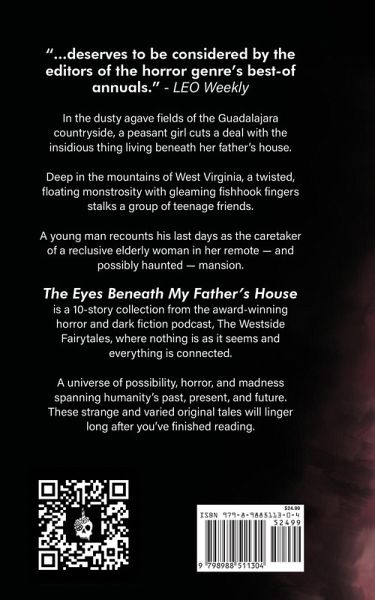 In the dusty agave fields of the Guadalajara countryside, a peasant girl cuts a deal with the insidious thing living beneath her father's house. Deep in the mountains of West Virginia, a twisted, floating monstrosity with gleaming fishhook fingers stalks a group of teenage friends. A young man recounts his last days as the caretaker of a reclusive elderly woman in her remote - and possibly haunted - mansion. The Eyes Beneath My Father's House is a 10-story collection from the award-winning horror and dark fiction podcast, The Westside Fairytales, where nothing is as it seems and everything is connected. A universe of possibility, horror, and madness spanning humanity's past, present, and future. These strange and varied original tales will linger long after you've finished reading.