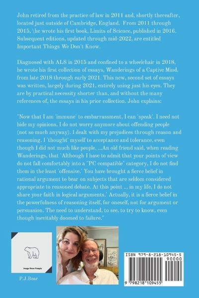 John retired from the practice of law in 2011 and, shortly thereafter, located just outside of Cambridge, England. From 2011 through 2015, he wrote his first book, Limits of Science, published in 2016. Subsequent editions, updated through mid-2022, are entitled Important Things We Don't Know. Diagnosed with ALS in 2015 and confined to a wheelchair by 2018, John wrote his first collection of essays, Wanderings of a Captive Mind, published in 2021. This new, second set of essays was written, largely during 2021, entirely using just his eyes. They are by practical necessity shorter than, and without the many references of, the essays in his prior collection. John explains: "Now that I am 'immune' to embarrassment, I can 'speak'. I need not hide my opinions. I do not worry anymore about offending people (not so much anyway). I dealt with my prejudices through reason and reasoning. I 'thought' myself to acceptance and tolerance, even though I did not much like people. ...An old friend said, when reading Wanderings, that 'Although I have to admit that your points of view do not fall comfortably into a "PC compatible" category, I do not find them in the least 'offensive.' You have brought a fierce belief in rational argument to bear on subjects that are seldom considered appropriate to reasoned debate. At this point ... in my life, I do not share your faith in logical arguments.¿' Actually, it is a fierce belief in the powerfulness of reasoning itself, for oneself, not for argument or persuasion. The need to understand, to see, to try to know, even though inevitably doomed to failure." Born in Columbus, Ohio, and raised in Northville, Michigan, he majored in economics at Amherst College (Class of 1970) and received his J.D. from The Harvard Law School in 1973. Following law school, he did post-graduate research at the University of Cambridge (Trinity College). In late 1974, John began a 37-year career as a commercial litigator with a major law firm in New York City. In March 2015, however, after his diagnosis, he returned to the U.S., settling in Old Town Alexandria, Virginia. His daughter Sarah and his son John Eliot and daughter-in-law Megan, with his two grandchildren, Hannah and Jeffrey, all live nearby.