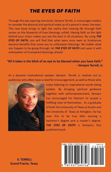 Through this eye-opening new book, Vempre Terrell, Jr. encourages readers to consider the physical and spiritual make up of a person's views: the eyes. This new book brings to light the reality that viewing life through faith serves as the blueprint of how blessings unfold. Having faith as the light behind your vision makes you see the best in all situations. By using THE EYES OF FAITH, you will find that what were once seen as hindrances become benefits that move you to unforeseen blessings. No matter what you happen to be going through, let THE EYES OF FAITH rest upon it with anticipation of triumphant blessings ahead!
