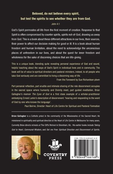 God’s Spirit permeates all life from the first moment of creation. Response to that Spirit is often compromised by counter spirits, spirits not-of-God, drawing us away from God. This is a book about these different attractions in our lives, their sources, their power to affect our decision making for good or ill. It is a book about human freedom and human limitation, about the need to acknowledge the unconscious places of unfreedom in our lives, and about the quest for inner freedom and wholeness for the sake of discerning choices that are life-giving. This is a unique book, blending quite revealing personal experience of God and sound, helpful teaching about the ways of God’s Spirit in individual lives and in community. The book will be of value to spiritual directors and pastoral ministers, indeed, to all people who take God seriously and are committed to living a discerning way of life. From the Foreword by Sue Richardson pbvm Part personal reflection, part erudite and intimate sharing of the role discernment occupies in the sacred space where humanity and Divinity meet, part guided meditation, Brian Gallagher’s memoir The Eyes of God is a first class example of a scholar-practitioner embodying Ernest Larkin’s description of discernment: ‘hearing and responding to the word of God by one who knows the language’. Paul Beirne, Director: Heart of Life Centre for Spiritual and Pastoral Formation