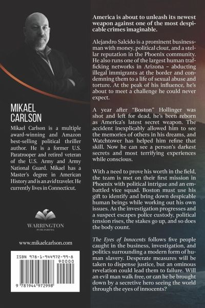 America is about to unleash its newest weapon against one of the most despicable crimes imaginable. From award-winning author Mikael Carlson, this sequel to The Eyes of Others is an action-packed political thriller featuring a real-life superhero. The Eyes of Innocents follows five people caught in the business, investigation, and politics surrounding a modern form of human slavery. Desperate measures will be taken to dispense justice, but an ominous revelation could lead them to failure. Will an evil man walk free, or can he be brought down by a secretive hero seeing the world through the eyes of innocents? "Boston" Hollinger is part Jason Bourne, part Jack Reacher, and he's about to put his special skills to work. The Watchtower Thrillers can be read as stand-alone novels, however, readers may find more enjoyment of the story by reading the novels in the order they were written.It's the things you don't expect that get you in the end. Alejandro Salcido is a prominent businessman with money, political clout, and a stellar reputation in the Phoenix community. He also runs one of the largest human trafficking networks in Arizona. Boston must use his gift to bring down despicable human beings, and as the tension rises and stakes go up, so does the body count. A year after "Boston" Hollinger was shot and left for dead, he's been reborn as America's latest secret weapon. The accident inexplicably allowed him to see the memories of others in his dreams, and Watchtower has helped him refine that skill. Now he can see a person's darkest secrets and most terrifying experiences while conscious. With a need to prove his worth in the field, the team is met on their first mission in Phoenix with political intrigue and an embattled vice squad. Boston must use his gift to identify and bring down despicable human beings while working out his own issues. As the investigation progresses and a suspect escapes police custody, political tension rises, the stakes go up, and so does the body count. Buy your copy today! For updates on Mikael Carlson's new releases, sign up for his newsletter at mikaelcarlson.com. Watchtower Thrillers (in order): The Eyes of Others The Eyes of Innocents The Eyes of Victims The Eyes of Addicts