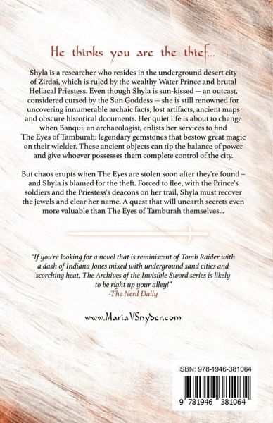 "Shyla is a researcher who resides in the underground desert city of Zirdai, which is ruled by the wealthy Water Prince and brutal Heliacal Priestess. Even though Shyla is sun-kissed--an outcast, considered cursed by the Sun Goddess--she is still renowned for uncovering innumerable archaic facts, lost artefacts, ancient maps, and obscure historical documents. Her quiet life is about to change when Banqui, an archaeologist, enlists her services to find The Eyes of Tamburah: legendary gemstones that bestow great magic on their wielder"--Back cover.
