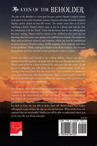 The Eyes of the Beholder is a rare gem because author Naomi Gordon's stories took place in the early twentieth century. Naomi's selection of words uniquely displays poetic charm to true life events. The stories come alive as if you're watching a movie. Naomi's father came to her in a dream and told her that her inheritance is in the "book." Little did she know that he was talking about her story writing. Naomi read her stories to her children as they grew up, not knowing that her stories were going to be published in a book. Her stories are filled with excitement, mystery, and suspense, which can later be transformed to movie theaters, Broadway plays, Netflix originals, Hulu originals, and other movie platforms. While reading her stories to six of her children, they became her audience and then decided to start putting her stories on paper. Naomi was above and beyond in her writing abilities. Naomi was able to capture every life experience in detail that she has seen through her hazel eyes. Words came to her in a form of rhymes for each story that she wrote. As she placed a calligraphy pen with black ink to a parchment paper, words were coming to her mind faster than she could write. This caused her to continue to write many events that took place in her life. This is a treat in itself to read. The Eyes of the Beholder will entertain you from the beginning to the end with great true life stories that seem unbelievable. Naomi has the ability of memorizing paragraphs and has mastered in the English vocabulary, which attributed to her writing skills. Naomi has a photographic memory as she remembered each and every story through each step of her life. Naomi also remembered every nursery rhyme, which she recited to her grandchildren. There have been many disappointments in her life, but through her faith in God, she was able to shake them off. Naomi hopes that readers will capture a part of their life that no one else has seen. What stories have you captured that are memorable? Maybe you will be able to understand where you are in your life now from your past.