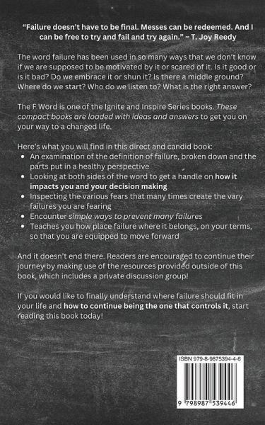 "Failure doesn't have to be final. Messes can be redeemed. And I can be free to try and fail and try again." ~ T. Joy Reedy The word failure has been used in so many ways that we don't know if we are supposed to be motivated by it or scared of it. Is it good or is it bad? Do we embrace it or shun it? Is there a middle ground? Where do we start? Who do we listen to? What is the right answer? The F Word is one of the Ignite and Inspire Series books. These compact books are loaded with ideas and answers to get you on your way to a changed life. Here's what you will find in this direct and candid book:An examination of the definition of failure, broken down and the parts put in a healthy perspective Looking at both sides of the word to get a handle on how it impacts you and your decision making Inspecting the various fears that many times create the vary failures you are fearing Encounter simple ways to prevent many failures Teaches you how place failure where it belongs, on your terms, so that you are equipped to move forward And it doesn't end there. Readers are encouraged to continue their journey by making use of the resources provided outside of this book, which includes a private discussion group! If you would like to finally understand where failure should fit in your life and how to continue being the one that controls it, start reading this book today!