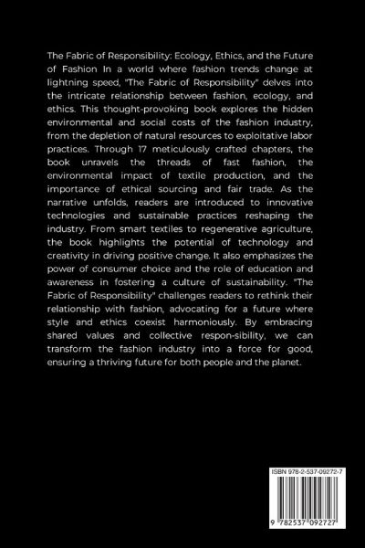 The Fabric of Responsibility: Ecology, Ethics, and the Future of Fashion In a world where fashion trends change at lightning speed, "The Fabric of Responsibility" delves into the intricate relationship between fashion, ecology, and ethics. This thought-provoking book explores the hidden environmental and social costs of the fashion industry, from the depletion of natural resources to exploitative labor practices. Through 17 meticulously crafted chapters, the book unravels the threads of fast fashion, the environmental impact of textile production, and the importance of ethical sourcing and fair trade. As the narrative unfolds, readers are introduced to innovative technologies and sustainable practices reshaping the industry. From smart textiles to regenerative agriculture, the book highlights the potential of technology and creativity in driving positive change. It also emphasizes the power of consumer choice and the role of education and awareness in fostering a culture of sustainability. "The Fabric of Responsibility" challenges readers to rethink their relationship with fashion, advocating for a future where style and ethics coexist harmoniously. By embracing shared values and collective responsibility, we can transform the fashion industry into a force for good, ensuring a thriving future for both people and the planet.
