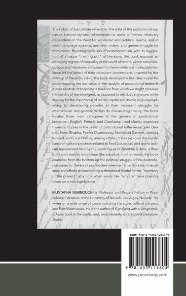 The Fabric of Subcultures reflects on the state of the postcolonial signature behind stylistic refinements - a world of letters relatively dependent on the West for economic and political realms, and in which language systems, aesthetic orders, and genres struggle for dominance. Rejecting facile talk of postmodernism, with its suggestion of a happy «melting pot» of literature, this book exposes an emerging regime of inequality in the world of letters, where minor languages and literatures are subject to the invisible but implacable violence (of the letter) of their dominant counterparts. Inspired by the writings of Pierre Bourdieu, the book develops the first clear model for understanding the real value of the republic of postcolonial letters (if it ever existed). It proposes a baseline from which we might measure the validity of the emergent, as opposed to residual, signature, while arguing for the importance of literary capital and its role in giving legitimacy to developing peoples in their incessant struggle for international recognition. Within its overarching theory, the book locates three main categories in the genesis of postcolonial literature - English, French, and Creolismo - and closely examines towering figures in the realm of postcolonial letters - Jacques Derrida, Homi Bhabha, Patrick Chamoiseau, Mahmoud Darwish, Jamaica Kincaid, and Caryl Phillips, among others. It also explores the significance of cultural practices related to food (couscous) and sports (soccer) represented here by the iconic figure of Zinédine Zidane, a Beur born and raised in la banlieue (the suburbs). In other words, the book examines from the bottom up the political struggle of the postcolonial subject in the era of postmodernity - one framed by sites of resistance and efforts at constructing a theoretical model for the «inventory of the present» at a time when words like «empire» have possibly taken on a new significance.