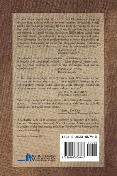 This is a print on demand book and is therefore non- returnable. After showing that today's evangelicals have not fared well in the crucible of modern pluralism, Lints argues that in order to regain spiritual wholeness, evangelicals must relearn how to think and live theologically. This book highlights several cultural and theological impediments to doing theology from an evangelical perspective, interacts with postmodernism as a theological method, and provides a provocative new outline for the construction of a truly "transformative" evangelical theology in the modern age.