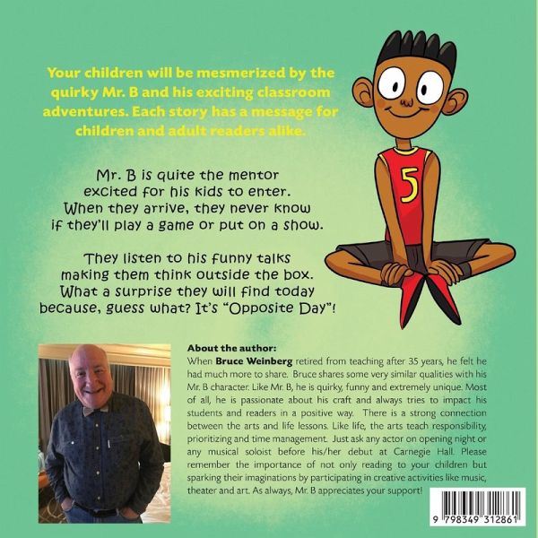 Your children will be mesmerized by the quirky Mr. B and his exciting classroom adventures. Each story has a message for children and adult readers alike. Mr. B is quite the mentor excited for his kids to enter. When they arrive, they never know if they'll play a game or put on a show. They listen to his funny talks making them think outside the box. What a surprise they will find today because, guess what? It's "Opposite Day"!