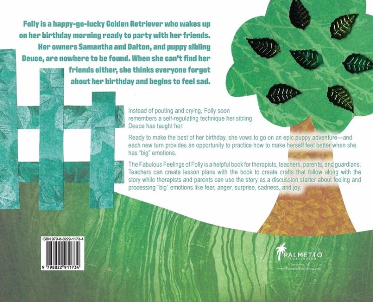 A dog named Folly wakes up to find that none of her friends came to celebrate with her on her birthday. She gains some courage, sets out on an adventure, and meets different obstacles that cause her to feel a variety of emotions. Folly is a happy-go-lucky Golden Retriever who wakes up on her birthday morning, ready to party with her friends. When she can't find her owners, sister, or friends, she thinks everyone forgot about her. Instead of wallowing in sadness, Folly remembers the self-regulating techniques her friends have taught her. She vows to go on an epic puppy adventure to make her birthday wonderful. With each new challenge comes a new opportunity to practice self-regulating techniques. Filled with colorful pages that each serve as a mini arts and crafts example, preschool, kindergarten, and elementary education teachers can create lesson plans and in-class crafts to complement a book read along. Intended for children between infancy and 6 years, parents and guardians can use The Fabulous Feelings of Folly to help their children learn to self-regulate when feeling "big" emotions like being upset, fear, and anger. In addition, The Fabulous Feelings of Folly features illustrated self-regulation techniques like counting, giving yourself a hug, stomping your feet, and using your words that teachers can use in their classrooms.