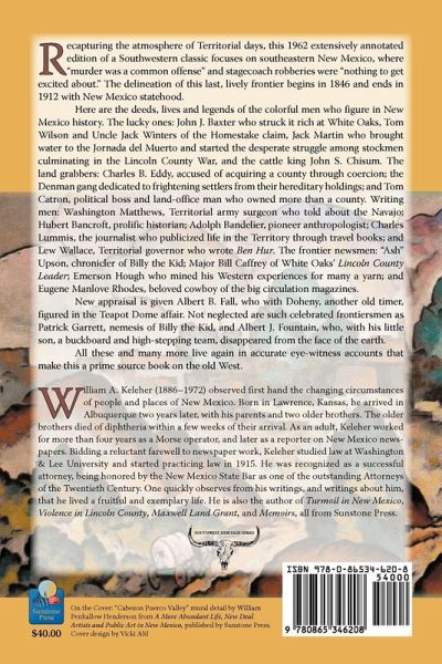 Recapturing the atmosphere of Territorial days, this 1962 extensively annotated edition of a Southwestern classic focuses on southeastern New Mexico, where "murder was a common offense" and stagecoach robberies were "nothing to get excited about." The delineation of this last, lively frontier begins in 1846 and ends in 1912 with New Mexico statehood. Here are the deeds, lives and legends of the colorful men who figure in New Mexico history. The lucky ones: John J. Baxter who struck it rich at White Oaks, Tom Wilson and Uncle Jack Winters of the Homestake claim, Jack Martin who brought water to the Jornada del Muerto and started the desperate struggle among stockmen culminating in the Lincoln County War, and the cattle king John S. Chisum. The land grabbers: Charles B. Eddy, accused of acquiring a county through coercion; the Denman gang dedicated to frightening settlers from their hereditary holdings; and Tom Catron, political boss and land-office man who owned more than a county. Writing men: Washington Matthews, Territorial army surgeon who told about the Navajo; Hubert Bancroft, prolific historian; Adolph Bandelier, pioneer anthropologist; Charles Lummis, the journalist who publicized life in the Territory through travel books; and Lew Wallace, Territorial governor who wrote "Ben Hur." The frontier newsmen: "Ash" Upson, chronicler of Billy the Kid; Major Bill Caffrey of White Oaks' "Lincoln County Leader"; Emerson Hough who mined his Western experiences for many a yarn; and Eugene Manlove Rhodes, beloved cowboy of the big circulation magazines. New appraisal is given Albert B. Fall, who with Doheny, another old timer, figured in the Teapot Dome affair. Not neglected are such celebrated frontiersmen as Patrick Garrett, nemesis of Billy the Kid, and Albert J. Fountain, who, with his little son, a buckboard and high-stepping team, disappeared from the face of the earth. All these and many more live again in accurate eye-witness accounts that make this a prime source book on the old West.