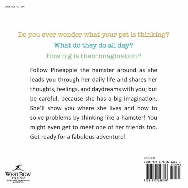 Do you ever wonder what your pet is thinking? What do they do all day? How big is their imagination? Follow Pineapple the hamster around as she leads you through her daily life and shares her thoughts, feelings, and daydreams with you; but be careful, because she has a big imagination. Shell show you where she lives and how to solve problems by thinking like a hamster! You might even get to meet one of her friends too. Get ready for a fabulous adventure!