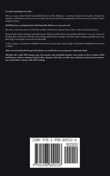 In a dark and dangerous world... Yuli, an assassin, finds himself uncontrollably drawn to Ren Hirokazu, a notorious criminal and murderer. Despite the obedience collar that forces him to carry out orders for the powerful Yakuza organization, Yuli cannot resist the allure of Ren's dangerous charm. He kills for pay, accepting the poison that keeps him delirious as a necessary evil. But when a mysterious discovery leads him to defect and become a hunted traitor, Yuli's world is turned upside down. Hunted by the Yakuza and other powerful enemies, Yuli has nowhere left to turn until Ren offers him a way out, a chance for freedom. But at what cost? As they navigate a world filled with danger, secrets, and betrayal, their forbidden love becomes a liability. Will they survive and trust each other enough to make it out alive? Or will their enemies destroy them? Warning: this a dark MM 40k novella romance, gay sci-fi romance, mm cyberpunk romance, mm enemies to lovers romance which includes gore, violence, mentions of sexual abuse, dystopia, short story, novella, mm sci-fi fantasy, mm possessive romance, mm second chance romance with a HEA ending.