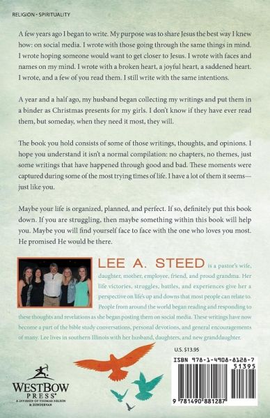 A few years ago I began to write. My purpose was to share Jesus the best way I knew how: on social media. I wrote with those going through the same things in mind. I wrote hoping someone would want to get closer to Jesus. I wrote with faces and names on my mind. I wrote with a broken heart, a joyful heart, a saddened heart. I wrote, and a few of you read them. I still write with the same intentions. A year and a half ago, my husband began collecting my writings and put them in a binder as Christmas presents for my girls. I don't know if they have ever read them, but someday, when they need it most, they will. The book you hold consists of some of those writings, thoughts, and opinions. I hope you understand it isn't a normal compilation: no chapters, no themes, just some writings that have happened through good and bad. These moments were captured during some of the most trying times of life. I have a lot of them it seems-just like you. Maybe your life is organized, planned, and perfect. If so, definitely put this book down. If you are struggling, then maybe something within this book will help you. Maybe you will find yourself face to face with the one who loves you most. He promised He would be there.