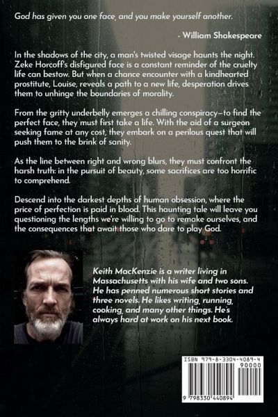 God has given you one face, and you make yourself another. - William Shakespeare In the shadows of the city, a man's twisted visage haunts the night. Zeke Horcoff's disfigured face is a constant reminder of the cruelty life can bestow. But when a chance encounter with a kindhearted prostitute, Louise, reveals a path to a new life, desperation drives them to unhinge the boundaries of morality. From the gritty underbelly emerges a chilling conspiracy - to find the perfect face, they must first take a life. With the aid of a surgeon seeking fame at any cost, they embark on a perilous quest that will push them to the brink of sanity. As the line between right and wrong blurs, they must confront the harsh truth: in the pursuit of beauty, some sacrifices are too horrific to comprehend. Descend into the darkest depths of human obsession, where the price of perfection is paid in blood. This haunting tale will leave you questioning the lengths we're willing to go to remake ourselves, and the consequences that await those who dare to play God.