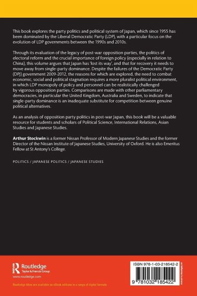 Through its evaluation of the legacy of post-war opposition parties, the politics of electoral reform and the crucial importance of foreign policy (especially in relation to China), this volume argues that Japan has 'lost its way', and that for recovery it needs to move away from single-party dominance. Despite the failures of the Democratic Party (DPJ) government 2009-2012, the reasons for which are explored, the need to combat economic, social and political stagnation requires a more pluralist political environment, in which LDP monopoly of policy and personnel can be realistically challenged by vigorous opposition parties. Comparisons are made with other parliamentary democracies, in particular the United Kingdom, Australia and Sweden, to indicate that single-party dominance is an inadequate substitute for competition between genuine political alternatives.