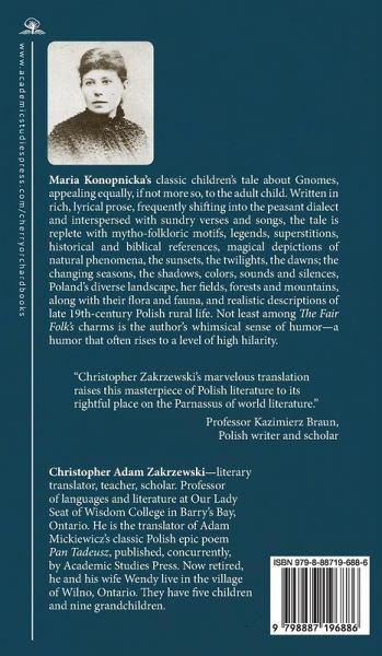 A classic children's tale about Gnomes, appealing equally, if not more so, to the adult child. Written in rich, lyrical prose, frequently shifting into the peasant dialect and interspersed with sundry verses and songs, the tale is replete with mytho-folkloric motifs, legends, superstitions, historical and biblical references, magical depictions of natural phenomena, the sunsets, the twilights, the dawns; the changing seasons, the shadows, the colors, the sounds and silences, Poland’s diverse landscape, her fields, forests and mountains, along with her flora and fauna, and realistic descriptions of late 19th-century Polish rural life. Not least among The Fair Folk’s charms is the author’s whimsical sense of humor-a humor that often rises to a level of high hilarity.