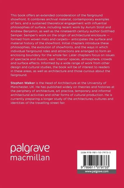 This book offers an extended consideration of the fairground showfront. It combines archival material, contemporary examples of fairs, and a sustained theoretical engagement with influential philosophies of surface, including recent work by Avrum Stroll and Andrew Benjamin, as well as the nineteenth century author Gottfried Semper. Semper's work on the origin of architectural enclosure -formed from woven mats and carpets- anticipates the surface and material history of the showfront. Initial chapters introduce these philosophies, the evolution of showfronts, and the ways in which individual fairground rides and attractions are arranged to form an enclosing boundary for the whole fair. Later chapters focus on issues of spectacle and illusion, vast 'interior' spaces, atmosphere, crowds and surface effects. Informed by a wide range of work from other design and cultural studies, the book will be of interest to readers in these areas, as well as architecture and those curious about the fairground.