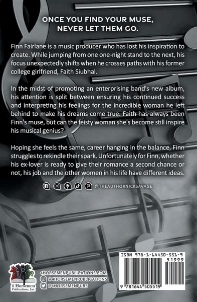 Once you find your muse, never let them go. Finn Fairlane is a music producer who has lost his inspiration to create. While jumping from one one-night stand to the next, his focus unexpectedly shifts when he crosses paths with his former college girlfriend, Faith Siubhal. In the midst of promoting an enterprising band's new album, his attention is split between ensuring his continued success and interpreting his feelings for the incredible woman he left behind to make his dreams come true. Faith has always been Finn's muse, but can the feisty woman she's become still inspire his musical genius? Hoping she feels the same, career hanging in the balance, Finn struggles to rekindle their spark. Unfortunately for Finn, whether his ex-lover is ready to give their romance a second chance or not, his job and the other women in his life have different ideas.
