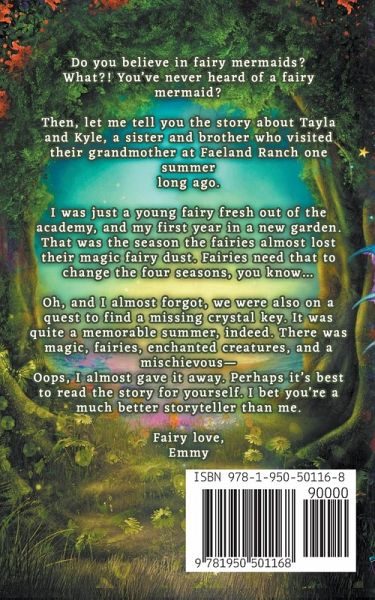 Do you believe in fairy mermaids? What?! You've never heard of a fairy mermaid? Then, let me tell you the story about Tayla and Kyle, a sister and brother who visited their grandmother at Faeland Ranch one summer long ago. I was just a young fairy fresh out of the academy, and my first year in a new garden. That was the season the fairies almost lost their magic fairy dust. Fairies need that to change the four seasons, you know… Oh, and I almost forgot, we were also on a quest to find a missing crystal key. It was quite a memorable summer, indeed. There was magic, fairies, enchanted creatures, and a mischievous— Oops, I almost gave it away. Perhaps it's best to read the story for yourself. I bet you're a much better storyteller than me. Fairy love, Emmy