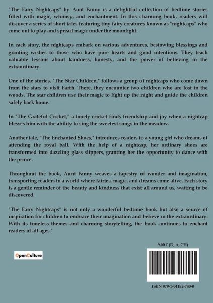 "The Fairy Nightcaps" by Aunt Fanny is a delightful collection of bedtime stories filled with magic, whimsy, and enchantment. In this charming book, readers will discover a series of short tales featuring tiny fairy creatures known as "nightcaps" who come out to play and spread magic under the moonlight. In each story, the nightcaps embark on various adventures, bestowing blessings and granting wishes to those who have pure hearts and good intentions. They teach valuable lessons about kindness, honesty, and the power of believing in the extraordinary. One of the stories, "The Star Children," follows a group of nightcaps who come down from the stars to visit Earth. There, they encounter two children who are lost in the woods. The star children use their magic to light up the night and guide the children safely back home. In "The Grateful Cricket," a lonely cricket finds friendship and joy when a nightcap blesses him with the ability to sing the sweetest songs in the meadow. Another tale, "The Enchanted Shoes," introduces readers to a young girl who dreams of attending the royal ball. With the help of a nightcap, her ordinary shoes are transformed into dazzling glass slippers, granting her the opportunity to dance with the prince. Throughout the book, Aunt Fanny weaves a tapestry of wonder and imagination, transporting readers to a world where fairies, magic, and dreams come alive. Each story is a gentle reminder of the beauty and kindness that exist all around us, waiting to be discovered. "The Fairy Nightcaps" is not only a wonderful bedtime book but also a source of inspiration for children to embrace their imagination and believe in the extraordinary. With its timeless themes and charming storytelling, the book continues to enchant readers of all ages."