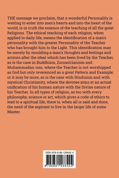 THE message we proclaim, that a wonderful Personality is waiting to enter into men's hearts and into the heart of the world, is in truth the essence of the teaching of all the great Religions. The ethical teaching of each religion, when applied to daily life, means the identification of a man's personality with the greater Personality of the Teacher who has brought him to the Light. This identification may be merely by moulding a man's thoughts and feelings and actions after the ideal which has been lived by the Teacher, as is the case in Buddhism, Zoroastrianism and Muhammadan-ism, where the Teacher is not worshipped as God but only reverenced as a great Pattern and Example; or it may be more, as is the case with Hinduism and with mystical Christianity, where the devotee aims at an actual unification of his human nature with the Divine nature of his Teacher. In all types of religion, as too with every philosophy, science or art, which gives a code of ethics to lead to a spiritual life, there is, when all is said and done, the need of the aspirant to live in the larger life of some Master.