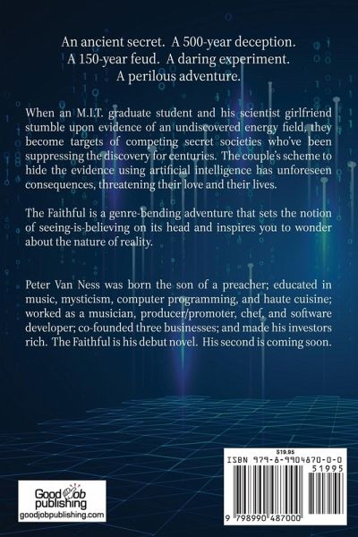 "Dan Brownish conspiracy reminiscent of a high tech The Da Vinci Code" - Joann Mackenzie, Editor, North of Boston Media Group An ancient secret. A 500-year deception.A 150-year feud. A daring experiment.A perilous adventure. When an M.I.T. graduate student and his scientist girlfriend stumble upon evidence of an undiscovered energy field, they become targets of rival secret societies who've been suppressing the discovery for centuries. The couple's scheme to hide the evidence using artificial intelligence has unforeseen consequences, threatening their love and their lives. The Faithful is a genre-bending adventure, plunging the reader into the minds and psyches of the couple as they each embark on a personal journey of self-discovery while grappling with the consequences of their decisions. The story sets the notion of seeing-is-believing on its head and will inspire you to wonder about the nature of reality.
