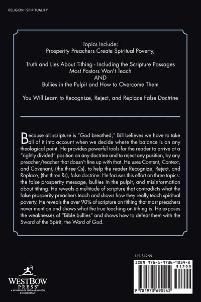 Because all scripture is "God breathed," Bill believes we have to take all of it into account when we decide where the balance is on any theological point. He provides powerful tools for the reader to arrive at a "rightly divided" position on any doctrine and to reject any position, by any preacher/teacher that doesn't line up with that. He uses Content, Context, and Covenant, (the three Cs), to help the reader Recognize, Reject, and Replace, (the three Rs), false doctrine. He focuses this effort on three topics: the false prosperity message, bullies in the pulpit, and misinformation about tithing. He reveals a multitude of scripture that contradicts what the false prosperity preachers teach and shows how they really teach spiritual poverty. He reveals the over 90% of scripture on tithing that most preachers never mention and shows what the true teaching on tithing is. He exposes the weaknesses of "Bible bullies" and shows how to defeat them with the Sword of the Spirit, the Word of God.