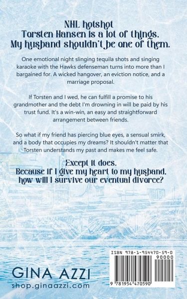 NHL hotshot Torsten Hansen is a lot of things. My husband shouldn't be one of them. One emotional night slinging tequila shots and singing karaoke with the Hawks defenseman turns into more than I bargained for. A wicked hangover, an eviction notice, and a marriage proposal. If Torsten and I wed, he can fulfill a promise to his grandmother and the debt I'm drowning in will be paid by his trust fund. It's a win-win, an easy and straightforward arrangement between friends. So what if my friend has piercing blue eyes, a sensual smirk, and a body that occupies my dreams? It shouldn't matter that Torsten understands my past and makes me feel safe. Except it does. Because if I give my heart to my husband, how will I survive our eventual divorce?