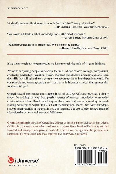 "A significant contribution to our search for true 21st Century education." -Bo Adams, Principal, Westminster Schools "We would all trade a lot of knowledge for a little bit of wisdom." -Aaron Butler, Falconer Class of 1998 "School prepares us to be successful. We aspire to be happy." -Robert Landis, Falconer Class of 2001 If we want to achieve elegant results we have to teach the tools of elegant thinking. We want our young people to develop the traits of our heroes: courage, compassion, creativity, leadership, invention, vision. We need our students and employees to learn the skills that will give them a competitive advantage in an interdependent world. Yet our schools and training centers are stuck in a 19th century model that ignores this fundamental goal. Geared toward the teacher and student in all of us, The Falconer provides a simple model for making the leap from passive learner of previous knowledge to an active creator of new ideas. Based on a five-year classroom trial, and now used by forward-looking educators to help build a 21st Century educational model, The Falconer adapts a novel interpretation of the classic book of strategy, The Art of War, to new goals of educational creativity and personal fulfillment. Grant Lichtman is the Chief Operating Officer of Francis Parker School in San Diego, California. He earned a bachelor's and master's degree from Stanford University and has founded and managed companies involved in education, energy, and the geosciences. Lichtman, his wife Julie, and two children live in Poway, California.